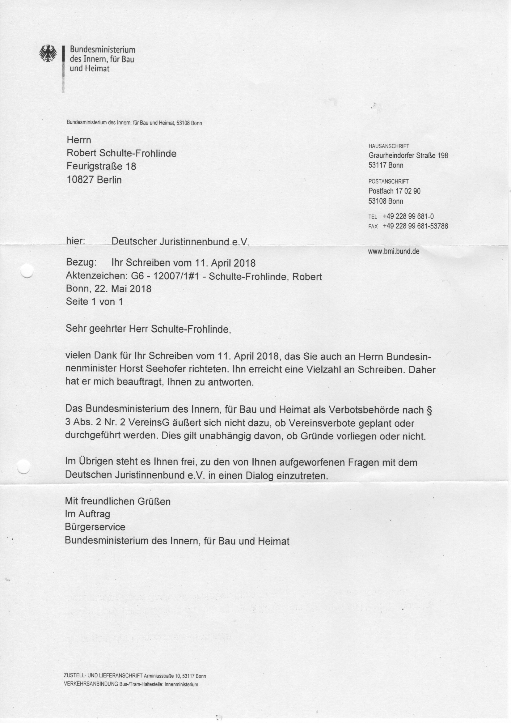 Nach telefonischer Auskunft des Ministeriums in Berlin ist mein Schreiben zur Bearbeitung an die Fachabteilung weiter geleitet worden. Mit Schreiben vom 22.05.2018 hat der Bürgerservice des Bundesministerium des Innern (die Fachabteilung) dann aus Bonn geantwortet. Das Bundesministerium des Innern spreche nicht öffentlich über Verbotsverfahren und besser als ein Verbotsverfahren sei es allemal, wenn der einzelne Bürger das Gespräch mit einer Vereinigung sucht, die unsere freiheitlich-demokratische Grundordnung bekämpft. Antwort